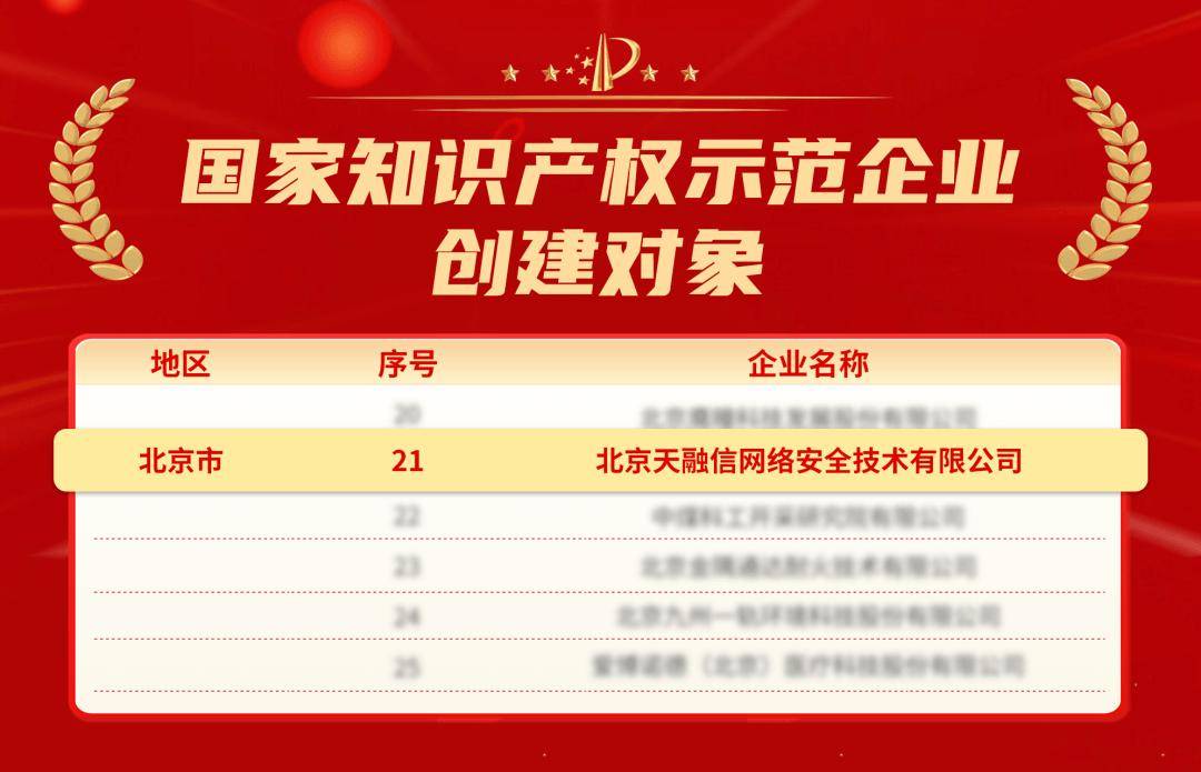 国家级荣誉+1天融信入选“国家知识产权示范企业创建对象”
