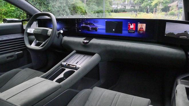 我们今天分别体验了先锋Plus版与旗舰quattro版两款车型。其中,前者为后置单电机,最大功率300千瓦,最大扭矩500牛米。而后者则配备双电机,系统总功率达到579千瓦,总扭矩800牛米,官方0-100公里/小时加速时间仅3.4秒。